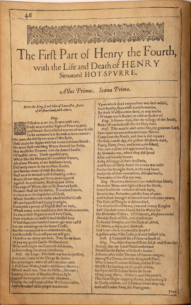 PHYSICAL DESCRIPTION This fragment consists of 13 printed pages of antique Renaissance rag paper. Eleven of the printed pages are double-sided and two pages, the first and last, are single-sided. Five additional pages of modern paper were inserted by the binder, three in front and two in back, including one single-sided title page. It is very finely bound in bright red textured patent leather with gold print and trim and labeled only on the spine, "First Folio, 1623." The bound cover measures 8-1/8" x 12-1/8" x 3/8". Inside pages measure 8" x 12". Inside the front cover on the bottom edge of the visible binding is tiny gold print that reads " Bound by Sangorski & Sutcliffe London England". Sangorski & Sutcliffe was established in 1901 and soon became one of Englandís foremost luxury bookbinders. The firm achieved world-wide fame for the exquisite bindings it produced throughout the 1900s, earning recognition as the most important bookbindery of the 20th century. The first three bound pages, inserted by the binder, are heavy, off white stationary paper of very high quality. Pages 1 and 2 are blank on both sides. The third page is a printed, single-sided title page: "Henry IV. / Part 1 / by / Wm. Shakespeare / The First Folio / 1623" The fourth bound page leaf is the first page of the original fragment. It is blank on side one, and side two is printed with the first page of print from Part 1 of Henry IV. The first printed page is on heavier paper than the inside pages. The page numbering begins with the first page of print and is numbered 46. It is followed by page 49. No portion of the play is missing or omitted between these pages. This is a pagination error that