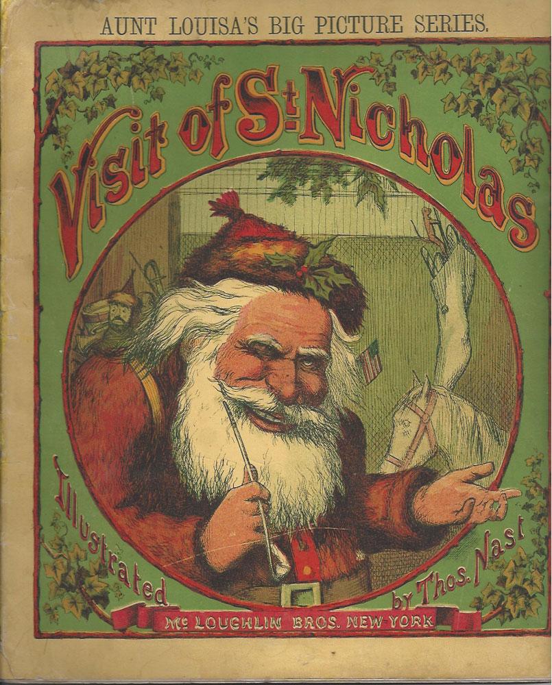 Nast's wonderful Christmas title. A Visit of St. Nicholas. (Inside title reads A Visit From St. Nicholas). MY: McLoughlin Brothers, no date, circa 1875. Printed on one side of the paper, this is a title in McLugholin's Aunt Louisa Big Picture Series. A good+ copy. Illustrated with six fabulous full page chromolithographs and with wonderfuly detailed b&w drawings on text pages by Thomas Nast. A great copy of this classic, extremely scarce. Msrshall 73.
